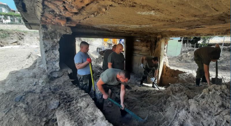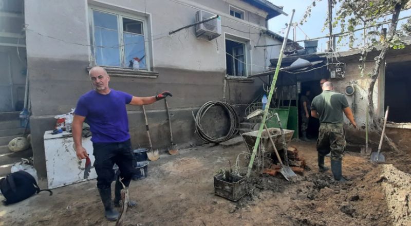 Военните са разчистили част от двора и къщата на Димитър Мачев, а преди този момент са избавили 86-годишната му майка от двуметровата вълна, заляла парцела. Димитър живее от 9 години в Англия и е взел отпуск, с цел да възвърне бащината си къща.