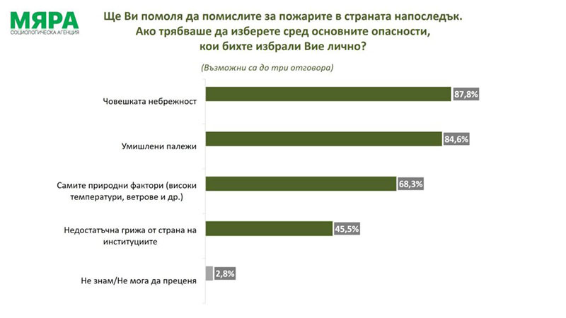 Помолени да изберат по лист до три съществени фактора за обстановката с пожарите в страната, 87,8% посочват човешката немарливост, 84,6% показват като фактор умишлените палежи, самата природа, да вземем за пример горещини, ветрове и така нататък, са посочени от 68,3%, а 45,5% показват като фактор незадоволителната грижа от страна на отрасловите институции. Така, наред с взискателността си към институциите, обществото демонстрира дори в още по-голяма степен по-скоро самокритична реакция.