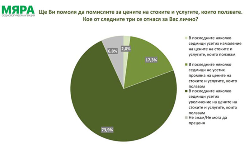 Междувременно, близо три четвърти от пълнолетните българи намират, че в последните седмици има нарастване на цените на стоките и услугите. „ В последните няколко седмици усетих понижение на цените на стоките и услугите, които употребявам “, споделят единствено 2% от пълнолетните българи, 17,3% не са усетили смяна в последните седмици, само че 73,9% избират опцията „ В последните няколко седмици усетих нарастване на цените на стоките и услугите, които употребявам “. Близо 7% не могат да преценяват.