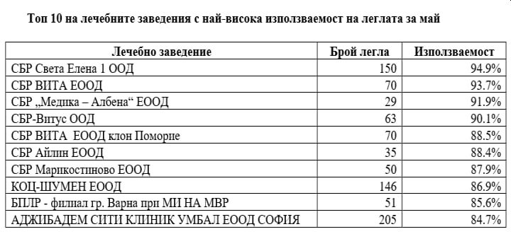 Най-висока през май е била използваемостта на леглата в СБР Света Елена 1 ООД , област Варна. Лечебното заведение разполага със 150 кревати, като за месеца използваемостта им е била 94.9%. С над 90 на 100 приложимост на леглата са и СБР ВИТА ЕООД, Велинград (93.7%), СБР „ Медика – Албена “ ЕООД, Добрич (91.9%) и СБР-Витус ООД, Пловдив (90.1%).