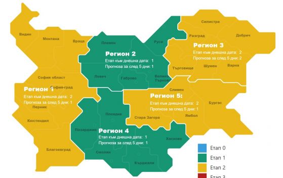 Два района са в стадий 1 съгласно пандемичния проект. Те включват областите Плевен, Русе, Ловеч, Габрово, Велико Търново, Пловдив, Пазарджик, Смолян, Хасково и Кърджали. При претовареност на интензивните кревати до 50% противоепидемичните ограничения се свеждат до носене на маска, присъствено образование с тестване един път седмично, вероятни са ограничавания при провеждане на проведени действия.