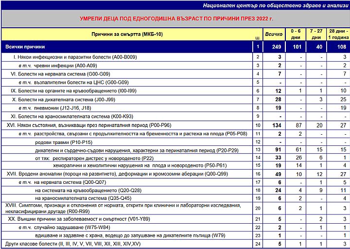 И през 2022 година водещата причина за смъртността на децата до една годишна възраст са положения, зараждащи през перинаталния интервал, измежду които с най-висока периодичност са дихателните и сърдечносъдовите нарушавания, присъщи за перинаталния интервал.