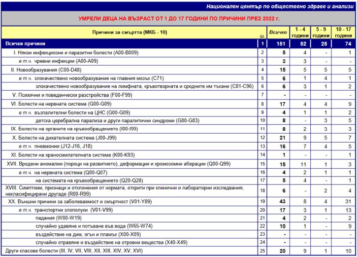 По-малко са умрелите деца до 17-годишна възраст общо (151 за 2022 година по отношение на 169 за 2021 г). С над 26 000 пък са по-малко общо умрелите през 2022 година (114 130 души) по отношение на 2021 година (140 439 души).