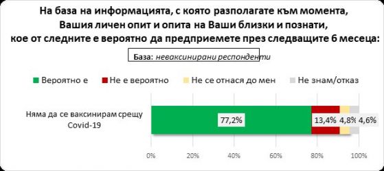 Сред неимунизираните респонденти делът на тези, които декларират, че няма да си слагат ваксина, е над три четвърти (77,7%) . Около една десета се движат дяловете на неимунизирани, които биха траяли в съответните стадии (с първа доза, цялостен курс и пр.).