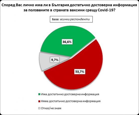 Липсата на задоволително надеждна информация е назовавана в експлицитен въпрос като проблем, въпреки в отговорите да проличава и прочут инерционен песимизъм. За повече от половината от всички запитани (53,7) достоверната информация за употребяваните в страната ни ваксини срещу COVID-19 не е задоволителна. Малко над една трета (36,6%) считат, че надеждната информация за имунизациите у нас е задоволително, а към една десета не могат да преценяват. Сред неимунизираните респонденти проличава и по-висок дял на отговорите, че достоверната информация за имунизациите не е задоволително.