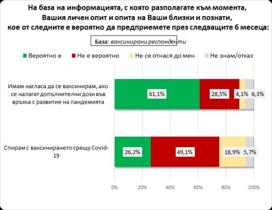 Изследването още един път демонстрира, че склонни към продължаваща имунизация са най-много самите имунизирани. Ваксинацията при останалите ще е в сериозна степен предизвикателство. 61,1% от всички имунизирани имат настройката да си слагат още ваксини (дори след бустерната), в случай че се наложи. Делът на имунизираните, които декларират, че не биха се ваксинирали повече срещу COVID-19 е 26,2%.