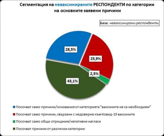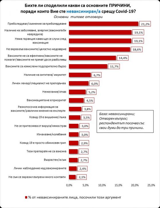 В отговор на въпроса „ Какви са главните аргументи, заради които Вие сте неимунизиран против COVID-19? ” една пета (21,2%) от неимунизираните у нас показват като причина за отвод от имунизация към този миг преболедуване на вируса. Към тях могат да се прибавят и отговорите на 6,7% от интервюираните, в които проличава разбиране (или знание), че съответният респондент има задоволително антитела или задоволително мощен имунитет. За почти една пета (19,1%) от хората, имунизацията в действителност би навредила заради съществуване на съпътстващи болести, алергии или други аргументи.