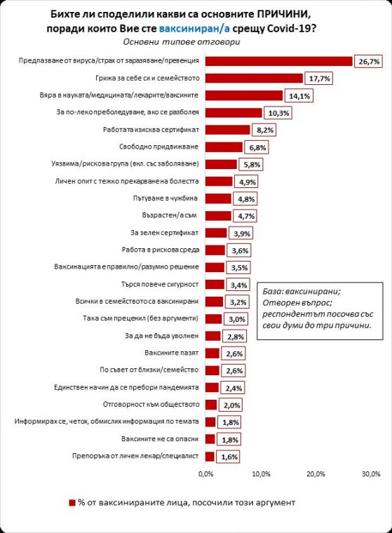 Причините за слагане на ваксина също бяха предмет на проучването. От отговорите проличава, че основа причина за имунизация – закономерно – е страхът от вируса и желанието на хората да се предпазят (26,7%). Грижата за фамилията и близките (17,7%), вярата в науката и медицината (14,1%) също са измежду водещите – явни и от време на време автоматизирани – аргументи за слагане на ваксина против ковид.