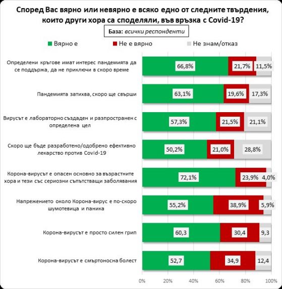 В същото време необятно болшинство в страната се съгласява, че коронавирусът е рисков най-много за възрастните и хора и тези със болести (72,1%). 63,1% показват мнението (и надеждата), че пандемията затихва и скоро ще завърши.