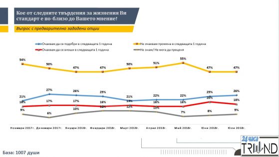 Малко над една четвърт чакат икономическото състояние да се усъвършенства в идната една година, до момента в който малко под една пета считат, че ще се утежни. Над 40% и максимален дял остават тези, които не чакат смяна в идната една година. Данните за упованията по отношение на виталния стандарт са изцяло сравними с тези за икономическото състояние в страната. И тук откриваме взаимозависимост по отношение на възрастта на респондентите, като тези сред 18 и 39 години са с най-оптимистични упования за икономическото състояние в страната и виталния си стандарт.