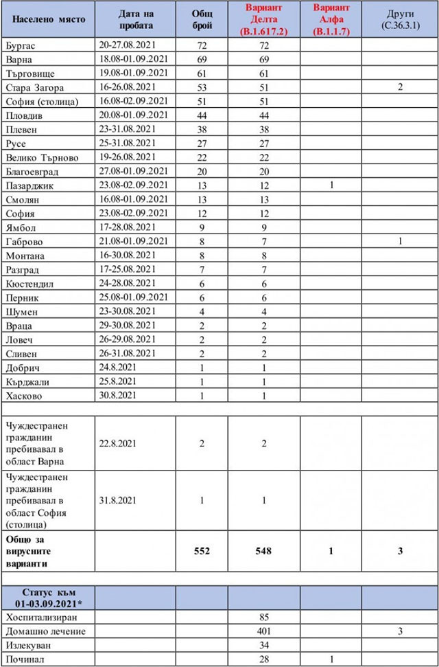 549 от 552 проби, които са оценени от Националния център за заразни и паразитни са посочили съществуване на Делта разновидността на Ковид-19. При 549 (или 99,5%) се откриха вирусни разновидности с нараснало значение за публичното здраве, като от тях 548 са Делта (B.1.617.2) и 1 е Алфа (B.1.1.7), се споделя в известие на здравните управляващи. В една клинична проба (0,2%) е открит вид C.36.3.1, който съгласно СЗО е присъединен в група вирусни разновидности под наблюдаване. Клиничните проби са взети от пациенти с Ковид-19 в интервала 16.08-02.09.2021 година и са изпратени от 53 разнообразни лечебни заведения от 26 области на страната. Таблицата с разпространяване на разновидностите на Ковид-19 в разнообразни области на страната: