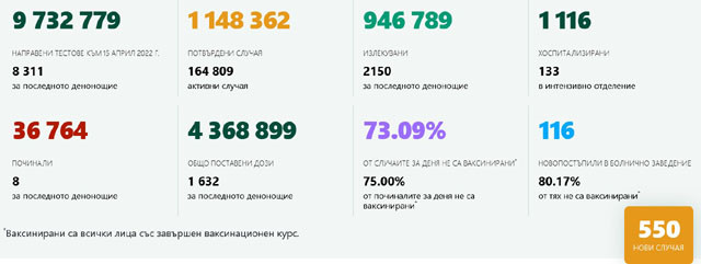 За последното денонощие са направени общо 8311 теста. Това значи, че новите случаи са 6,62 % от тестваните.