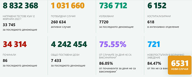 Към момента в лечебни заведения за болнична помощ се намират общо 6 152 пациенти с потвърдена коронавирусна зараза. 618 от тях са настанени в интензивни структури. Новопостъпилите в болнично заведение лица са 721, от които 84,47 % не са имунизирани, демонстрира Единният информативен портал.