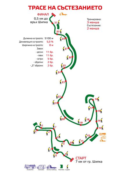 Стартът на трасето е на 7 километра след град Шипка, а финалът – на половин километър преди връх Шипка, дължината на трасето е 5,1 км, завоите са 22 – 11 леви и 11 десни, като 5 от тях са остри.