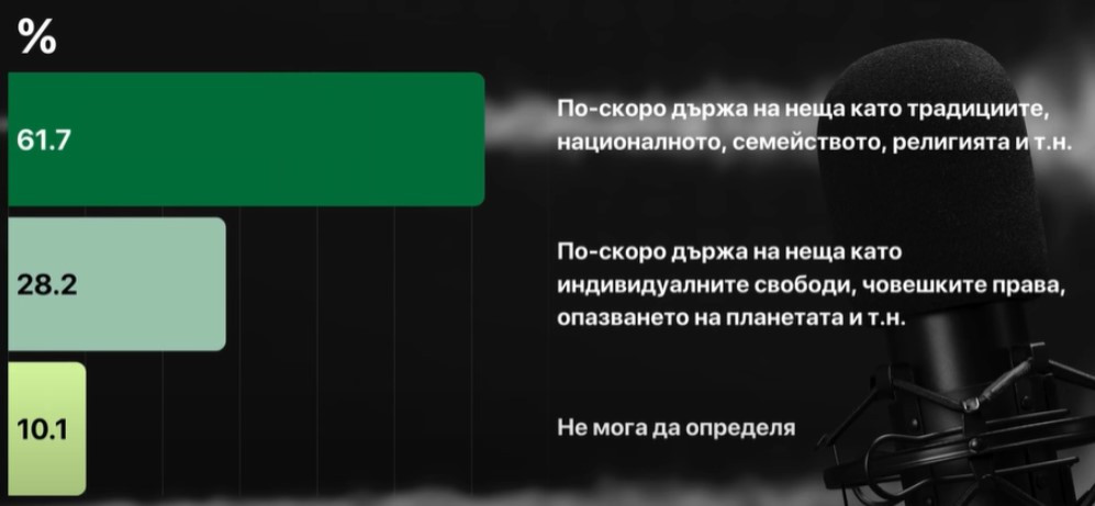 61.7% от българите по-скоро държат на неща като традициите, националното, фамилията, религията и така нататък Това излиза наяве от новото изследване на " Мяра ", показано в подкаста на социологическата агенция.