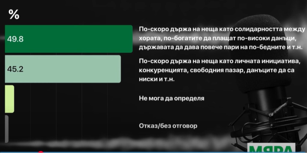 49.8% от интервюираните по-скоро държат на неща като солидарността сред хората, по-богатите да заплащат по-високи налози, страната да дава повече пари на по-бедните и така нататък