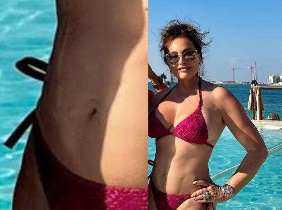 Предвид суетния й темперамент обаче не можем да не се запитаме за какво не е избрала цялостен бански, който да прикрие големия белег.