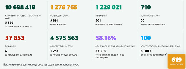 619 са новите случаи с ковид за последното денонощие у нас, а смъртните случаи са 6, оповестява Единният информативен портал.