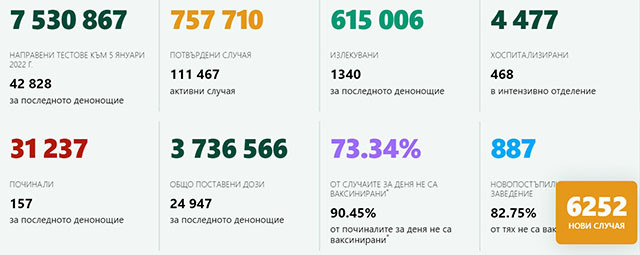 С потвърдена коронавирусна зараза в лечебни заведения за болнична помощ се намират общо 4 477 пациенти, 468 от които са настанени в интензивни структури. Новопостъпилите в болнично заведение лица са 887. От тях 82,75% не са имунизирани, демонстрира Единният информативен портал.