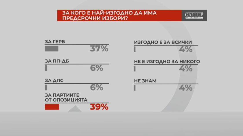 39% от участвалите в изследването считат, че опозиционните партии биха имали най-голяма полза от нови предварителни избори. Колкото до не/коалиционните сътрудници 37% считат, че ГЕРБ-СДС биха извлекли изгода от нов избор против едвам 6%, които са показали ПП-ДБ.
