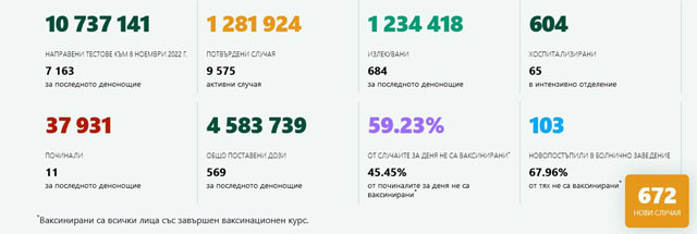 672 нови случая на заболели от COVID-19 са били регистрирани в България за последното денонощие. Те са открити със 7163 теста, което значи, че делът на позитивните е 9,3%, демонстрират данните от Единния информативен портал.