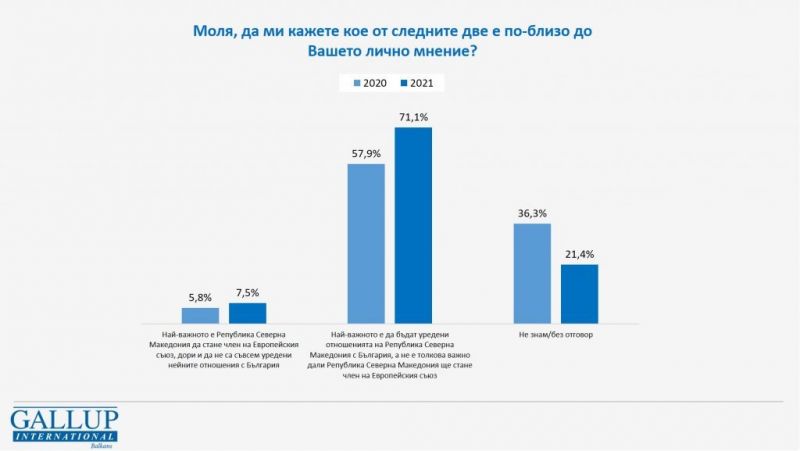 В рамките на две следващи години (2020 година и 2021 г.) „ Галъп интернешънъл болкан “ ревизира настройките на българските жители и по още един, обвързван с тематиката „ Северна Македония “, знак – целите на българите по отношение на съседката ни.