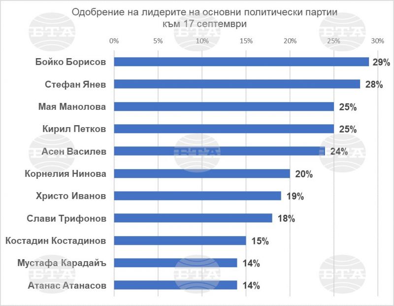 Бойко Борисов е най-одобряваният водач на политическа партия с утвърждение от 29%. Следва го Стефан Янев, който е одобряван от 28%. Мая Манолова е одобрявана от 25%, Кирил Петков също е одобряван от 25%, а Асен Василев - от 24%. Корнелия Нинова е одобрявана от 20% от българите, а Христо Иванов – от 19%. Слави Трифонов печели утвърждението на 18% от гласоподавателите, Костадин Костадинов - на 16%, Мустафа Карадайъ и Атанас Атанасов - на по 14%.
