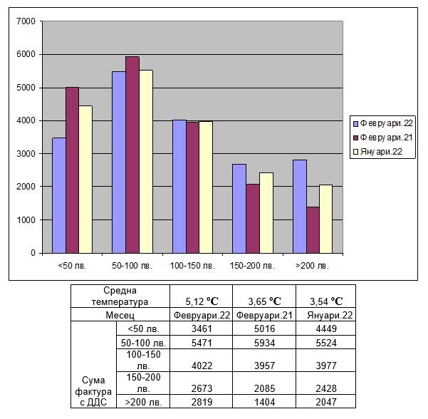 Анализ на фактурите за топлинна сила за месец ФЕВРУАРИ 2022 година демонстрира, че сумите, които клиентите ще заплатят са по-високи спрямо месец ФЕВРУАРИ 2021 година, заради обстоятелството, че продължителността на отчетния е по дълъг със седем дни в съпоставяне със същия интервал на предходната година.
