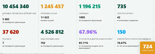 724 са новите инфектирани с ковид у нас за последното денонощие при направените 5682 теста. Това регистрира Единният информативен портал за 6 септември.