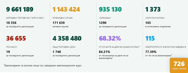 935 130 е броят на излекуваните, 1290 през последното денонощие. 4 358 480 са общо поставените дози ваксини у нас. 1748 са за последното денонощие.