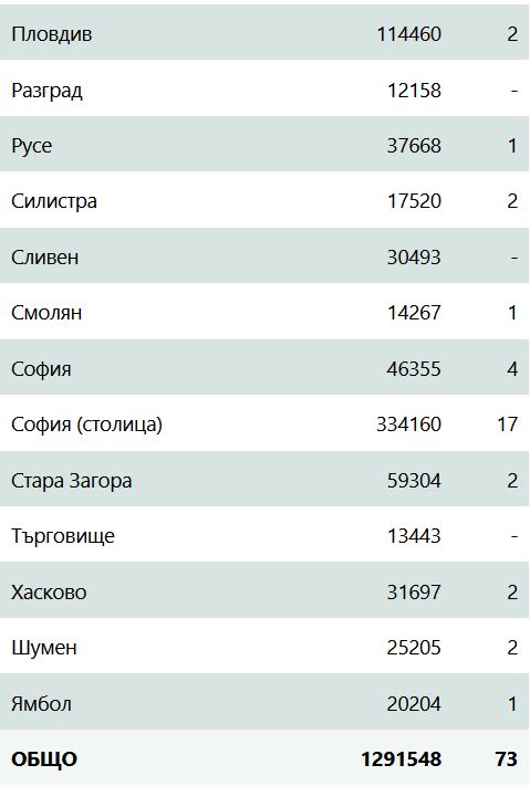 73 са новите случаи на COVID-19 у нас за последното денонощие, сочат данните на Единния информативен портал. Направени са 1 142 теста, което значи, че позитивни са 6,4% от пробите.