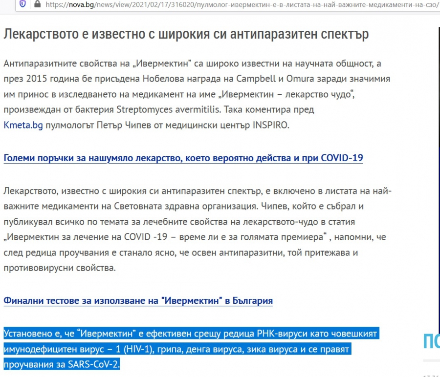 В България тестваният в изследване на „ Хювефарма ” лекарствен артикул с Ивермектин – " ", към този момент има разрешение за комерсиална приложимост т.е. свободна продажба в аптеките, прецизираха от ИАЛ и здравното министерство пред. Лекарството се купува с рецепта и е за лекуване на стомашно-чревна стронгилоидоза (ангилулоза). А в интернет към този момент можете елементарно да се натъкнете и на. Достатъчно е и да пуснете в Гугъл търсене по следните основни думи: " Ивермектин е в листата на най-важните лекарства на СЗО ", с цел да видите по-апетитен пиар (един от първите резултати в търсачката е Нова телевизия, за която ) и основното изречение: " Установeно е, че “Ивермектин ” е ефикасен против редица РНК-вируси като човешкият имунодефицитен вирус – 1 (HIV-1), грипа, денга вируса, зика вируса и се вършат изследвания за SARS-CoV-2 ". Само че NIH споделя за всичко това в цитираното нагоре решение да не трансформира към този момент насоките за приложимост на лекарството в Съединени американски щати, че е на лабораторно равнище – " няма докладвани клинични изследвания за клиничната изгода от Ивермектин за пациенти, разболели се от следните вируси – денга, зика, ХИВ и жълта тресчица ".