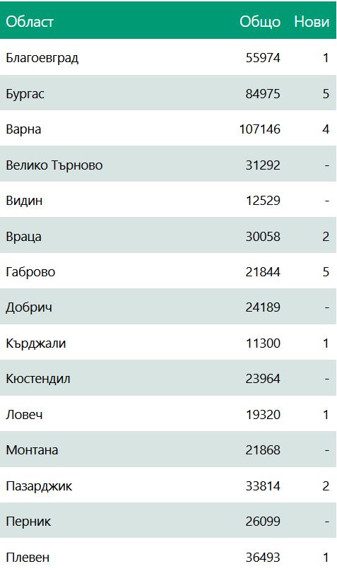 Новите случаи са открити от 2123 теста (3.63 % са положителни). Общият брой на доказаните случаи на COVID-19 у нас към този момент е 1 308 003. Те са били открити от 11 246 006 теста (11.63 % са положителни).