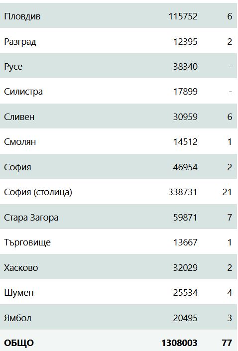 77 нови случая на COVID-19 са били регистрирани през последното денонощие в България. Починали са двама души с доказана коронавирусна зараза. Това показват данните от Единния информативен портал.