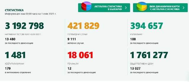 Най-много новозаразени за денонощието са регистрирани в столицата – 29. Във Варна новите случаи са 8, а в Стара Загора – 7. В Бургас новозаразените за денонощието са 6, Видин – 5, Габрово – 1, Кюстендил – 2, Ловеч – 1, Монтана – 1, Перник – 1, Плевен – 1, Пловдив – 4, Разград – 1, Русе – 1, Сливен – 1, София-област – 5, Хасково – 1, Шумен - 1, Ямбол – 2 новозаразени за денонощието. Източник: dnesplus.bg