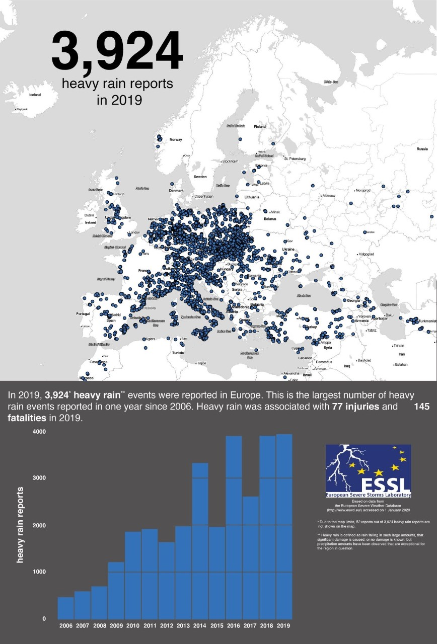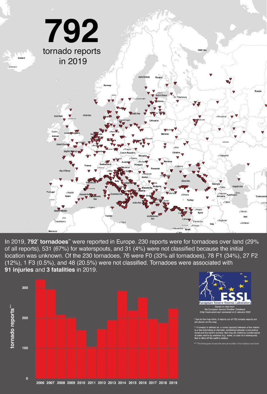 792 случая на смерч в Европа са регистрирани през 2019 г. от портала за рисково време „ European Severe Storms Laboratory ”. В една трета от случаите (230) вихрите са били торнадо и са се образували над земя, до момента в който останалите са категоризирани като водни смерчове. Загиналите по време на бурите са 3 души, а ранените - 91.