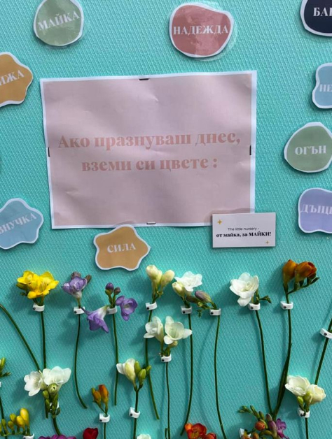 " Ако празнуваш през днешния ден, вземи си цвете ", това четем на табло, окичено с красиви цветенца. Без подозрение те са предопределени за всички дами, които празнуват днешния празник.
