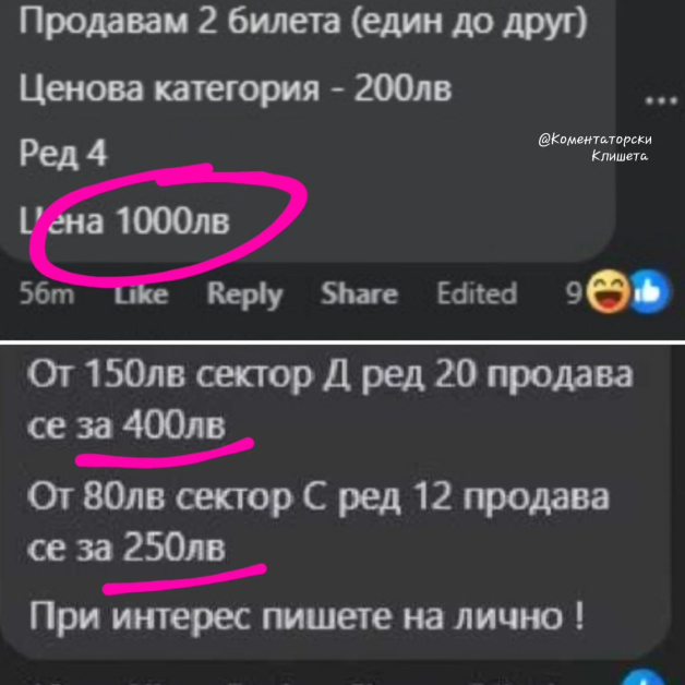 Междувременно стана ясно, че не са закъснели и продажбите на " черно ". Ценните хартийки обаче се продават на тройни цени. Офертите са билета от 200 лв. да се предлага за 500-1000 лв., 150 лв. за 400 лв., и 80 лв. за 250 лв. поради " огромно търсене ".
