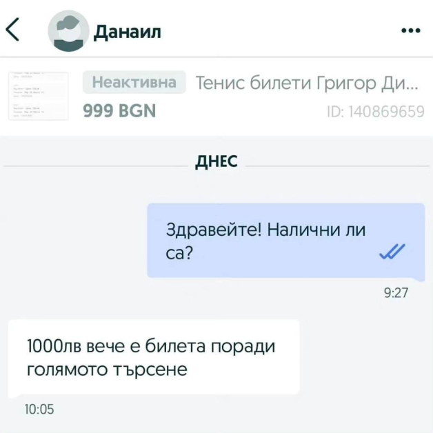 Нашенец пусна билети за Гришо-Джокович за 500 лв., после вдигна на 1000 лв.