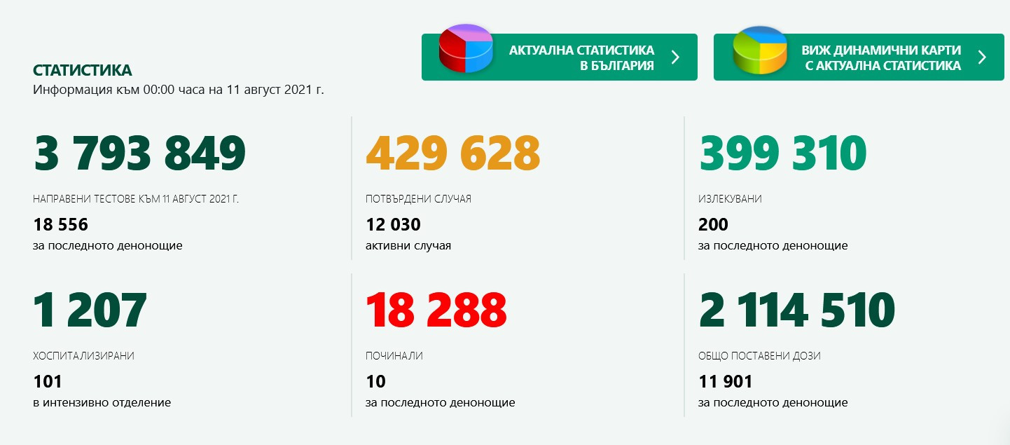 805 души са новозаразените с ковид през днешния ден, с 31 повече от през вчерашния ден. Излекувани са 200 души, в болница са 1207, от тях в интензивни отделения са 101 души. Починалите са 10 за последното денонощие. Общо досега заболелите са 429 628 българи. Излекуваните са 399 310 българи. Починалите досега са 18 288 души. Карантинираните са 1 362 797 души. От тях дейни са 18 172 души. Броят на тестванията е 3 793 849. Новите за през днешния ден са 18 556, от които PCR проби са 5089, а бързите - 13 467. Така процентът на инфектираните по отношение на изследваните е 4,34. Общият брой на сложени ваксини за последното денонощие са 11 901, а общо - 2 114 510 дози. С цялостен приключен цикъл са 1 049 156 българи.