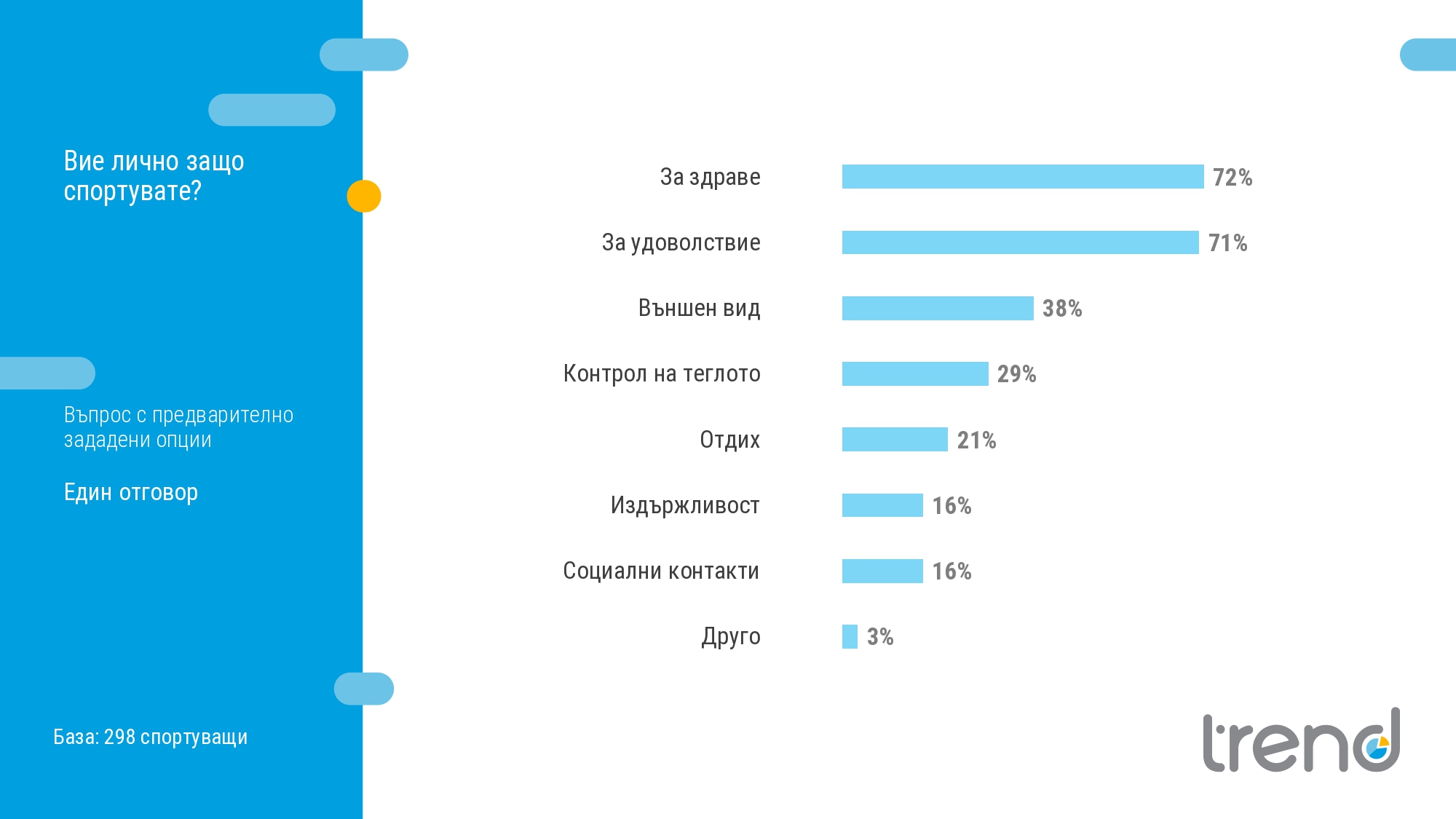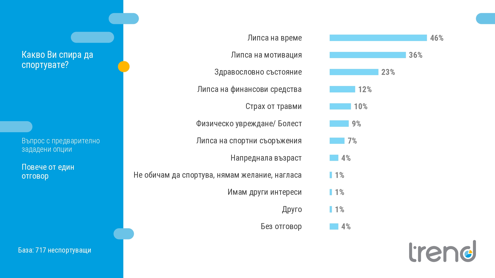 Българите, които не спортуват, показват три съществени аргументи за това - липса на време (46%), липса на мотивация (36%) и здравословното им положение (23%).