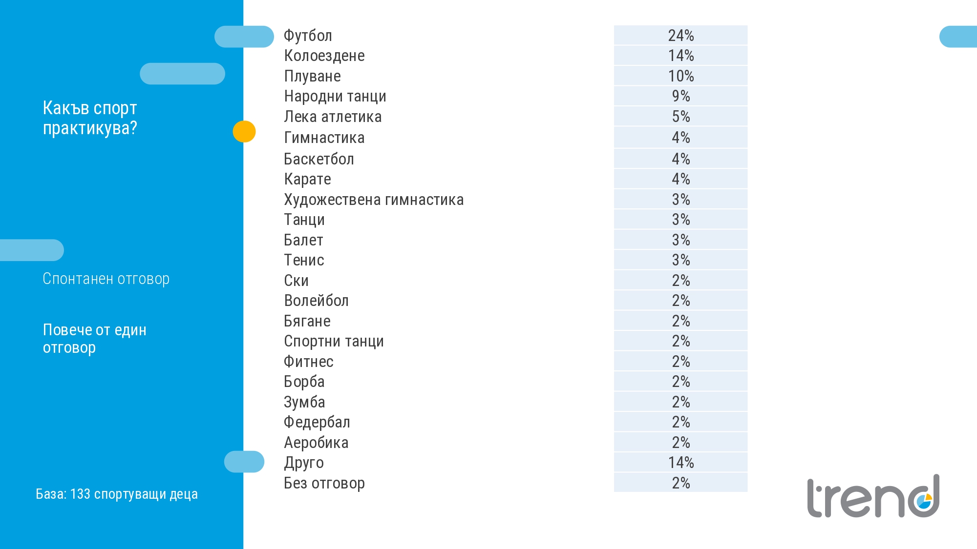 Според настоящите данни на " Тренд " 57% от децата на възраст сред 5 и 13 години спортуват. Момчетата спортуват повече от девойките - 63% против 52%.