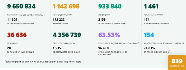 839 са новодиагностицираните с COVID-19 лица у нас за миналите 24 часа. Това е с 341 случая по-малко от през вчерашния ден, сочат данните на Единния информативен портал.