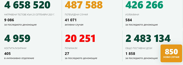 850 са новодиагностицираните с COVID-19 лица у нас през миналите 24 часа, от които 450 са открити с PCR, а 400 - с бързи антигенни проби. Общият брой на тестванията, направени за последното денонощие, е 9076. От тях 9,4% са дали позитивен резултат за коронавирусната зараза. Това демонстрира Националната осведомителна система.  158 са новодиагностицираните в столицата, като към тях се прибавят и още 34 от Софийска област. В Бургас новите случаи на COVID-19 са 99, във  Варна - 81, в Пловдив - 74, в Сливен - 46, в Перник - 43. В Стара Загора са открити нови 37 случая на COVID-19, в Благоевград - 30, в Добрич - 23, в Кюстендил - 22, в Плевен и Търговище - по 21, в Габрово и Велико Търново - по 19, в Ямбол - 17, в Русе - 16, в Монтана - 14, в Хасково - 13, в Ловеч - 12, в Разград и Враца - по 9, в Силистра - 8, в Пазарджик - 7, в Смолян - 6, в Кърджали - 5, във Видин - 4 и в Шумен - 3. Област Общо Нови Благоевград 21583 30 Бургас 32567 99 Варна 36841 81 Велико Търново 12601 19 Видин 3694 4 Враца 11176 9 Габрово 7957 19 Добрич 9176 23 Кърджали 5397 5 Кюстендил 9969 22 Ловеч 6703 12 Монтана 7474 14 Пазарджик 13648 7 Перник 9066 43 Плевен 14831 21 Пловдив 43521 74 Разград 4755 9 Русе 16415 16 Силистра 6954 8 Сливен 12173 46 Смолян 5631 6 София 15590 34 София (столица) 121935 158 Стара Загора 20993 37 Търговище 5610 21 Хасково 11910 13 Шумен 11215 3 Ямбол 8203 17 ОБЩО 487588 850 В България все още са доказани общо 487 588 случая на новия ковид. 41 071 от тях са дейни. 426 266 са излекуваните лица. 584 от тях са регистрирани през миналото денонощие. В лечебни заведения за болнична помощ се намират общо 4 959 пациенти с потвърдена коронавирусна зараза. 405 от тях са настанени в интензивни отделения или клиники.  Общо 2 483 134 са поставените у нас дози от имунизациите против COVID-19. 1858 от тях са приложени през последните 24 часа. Според Националната осведомителна система медицинските чиновници, при които е доказан новият ковид у нас, са общо 14 287. През последното денонощие са регистрирани нови 9 случая,. Починалите лица, при които е била установена коронавирусната зараза, са 20 251. Нови 27 случая са регистрирани през миналото денонощие. Ден по-рано у нас бяха диагностицирани с COVID-19 нови 2192-ма, а преди седмица, в сряда - 1862-ма.