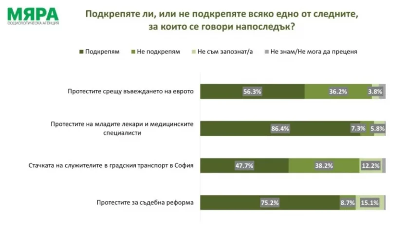 Протестите за правосъдна промяна, да вземем за пример, също извикват автоматизирана поддръжка, въпреки и не на равнищата във връзка с медиците. Подкрепят 75,2%, не поддържат 8,7%, 15,1% отиват в „ междинната “ алтернатива „ не съм осведомен “ и това демонстрира и степен на нееднозначност на оценката, а 1% не знаят какво да отговорят или не могат да преценяват. Възможно е тук спомагателна роля да изиграва многогодишната кардинална настройка за непълнота на правдивост в обществото ни и обичайното съмнение към институциите. Затова и във връзка с правосъдната промяна или пък младите лекари мненията са съвсем еднопосочни, до момента в който при митингите против еврото, да вземем за пример, ярката политизация на тематиката е направила по този начин, че се сблъскват два вида отзиви. Нещо сходно се е случило и с политизацията в стачката в градския превоз в София.