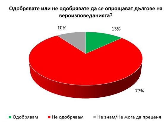 По другата тематика от последните седмици: 77% от запитаните не утвърждават да се опрощават задължения на вероизповеданията. 13% са на противоположното мнение и декларират своето утвърждение, а 10 на 100 не могат да преценяват.