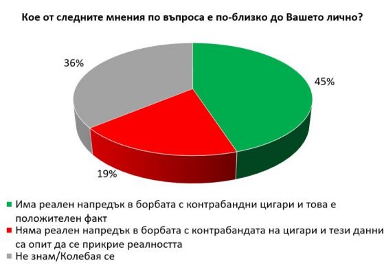 45% от респондентите виждат действителен прогрес в битката с контрабандни цигари у нас и го регистрират като позитивен факт. Според 19 на 100 няма действителен прогрес и данните са опит да се прикрие действителността. Висок е и процентът на хората, които се двоумят – 36 на 100.