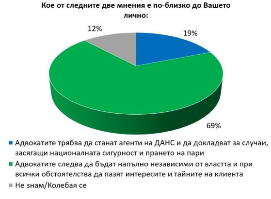 69% от българите са на мнение, че юристите в страната би трябвало да са изцяло самостоятелни от властта и да пазят ползите и тайните на клиента си. 19 на 100 от запитаните са на противоположното мнение и поддържат концепцията юристите да станат на процедура сътрудници на ДАНС и да рапортуват за случаи, засягащи националната сигурност. Останалите 12% се двоумят.
