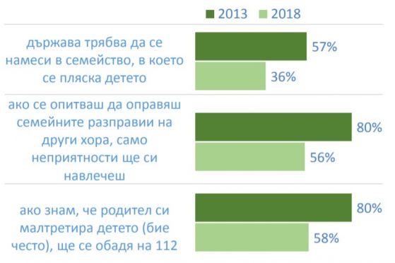 Докато през 2013 година 80% от хората са считали, че намесата в фамилните разправии на други хора води единствено до неприятности, то през 2018 година делът им е понижен на 56%.