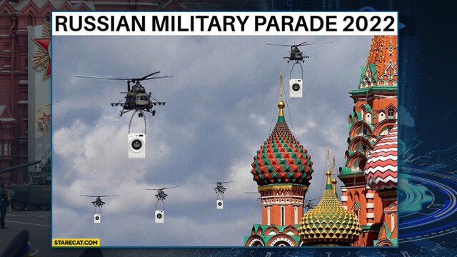 9 май провокира създателите на карикатури и колажи. Като този, който демонстрира съветски военни хеликоптери, които придвижват перални машини над емблематичните за Червения площад кубета на храма " Св. Василий Блажени ". Като увещание за мародерствата, осъществени от съветските военни в Украйна.